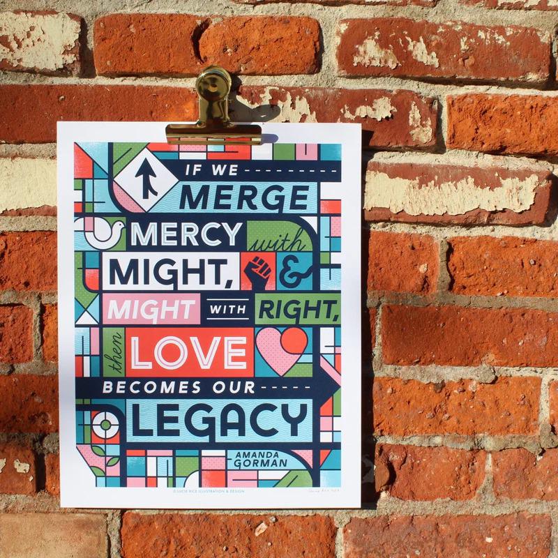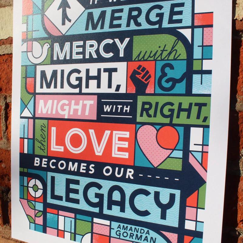 Art print featuring the beautiful and inspiring words of Amanda Gorman from her poem "The Hill We Climb". Hand signed and are packaged in a clear protective sleeve with backing board. Printed on a heavy coated card stock that reproduces color beautifully with a 1" white border.