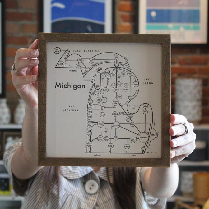 A very simple diagram of a very beautiful state. From Iron Mountain to Detroit travel the Mitten State in style from your own home! * 8 x 8 inches * Letterpress printed in the USA