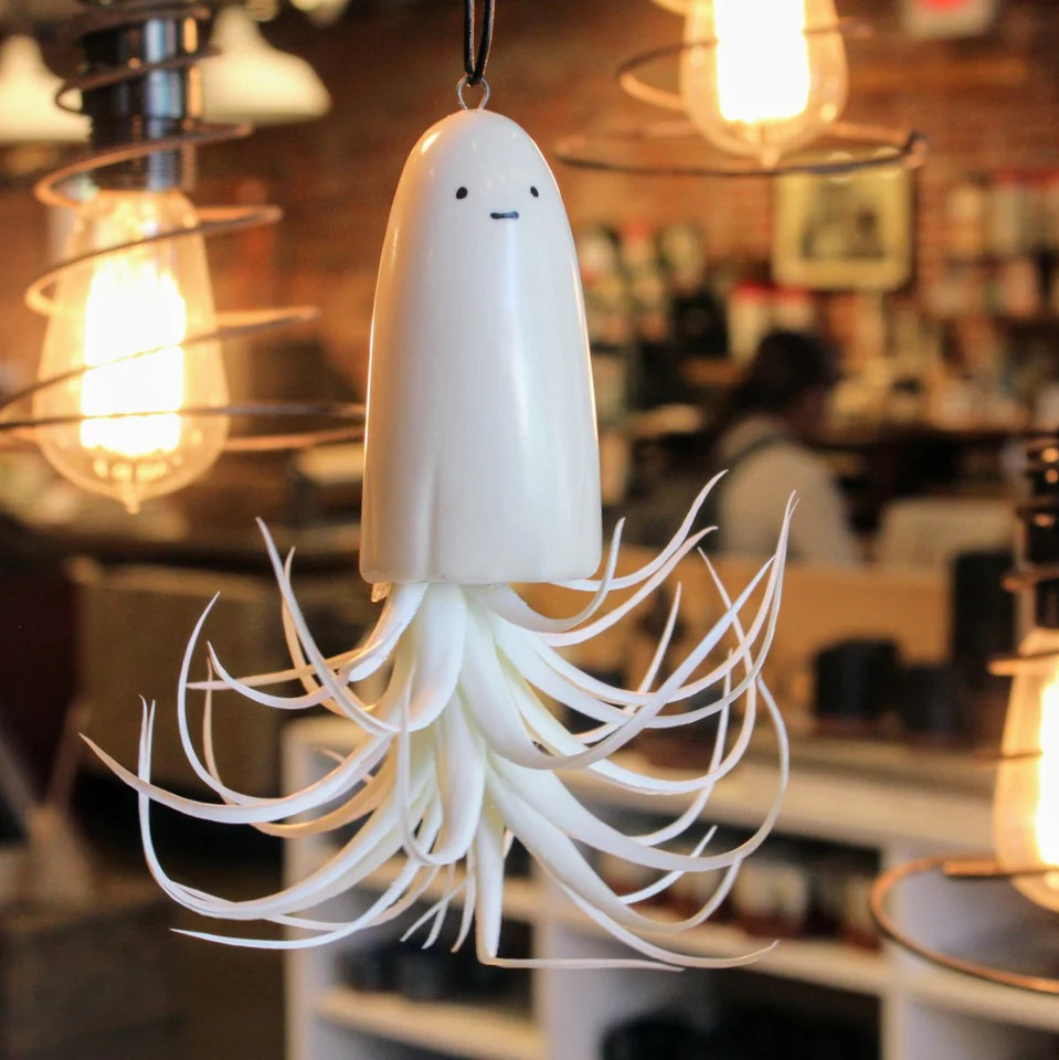 A ghost shaped ornament that doubles as an air plant holder. These spooky ghosts can fit most air plants and can be hung on the wall, a spooky branch, or your table to liven things up. 1.75 x 3.75 inches