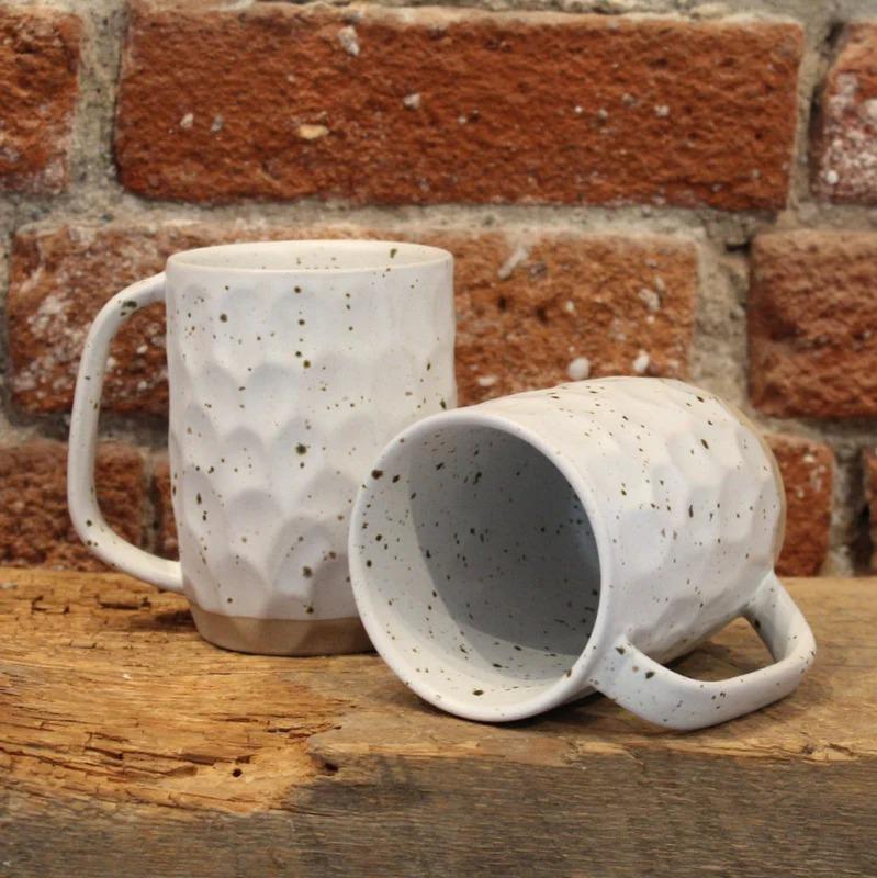 Mix and mingle! Finished up top with a geometric stamped design, a speckled white glaze, and raw clay peeking through at the bottom for an added dose of style. Use the shapely handle to sip your favorite blend of coffee or tea in style, or plant a little something in there for an unexpected gift. 4.25"x 4" Holds 10 fluid ounces.