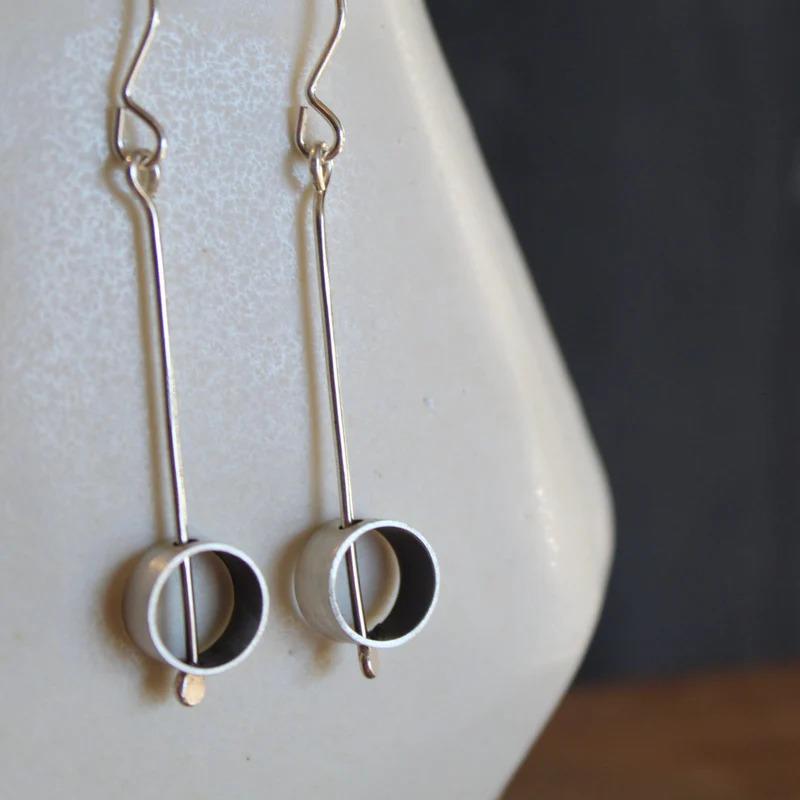 Grab these long dangle earrings to start your Minimalist Collection. Made from recycled sterling silver, a long, solid stem cuts through the hand sawed cylinder at the bottom. 2.5 inches long Made in Maine