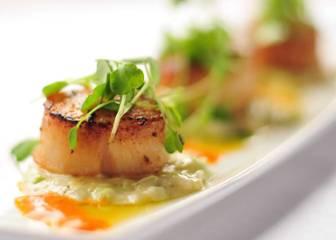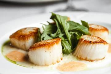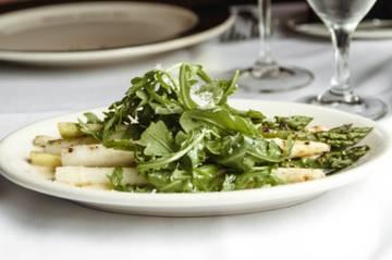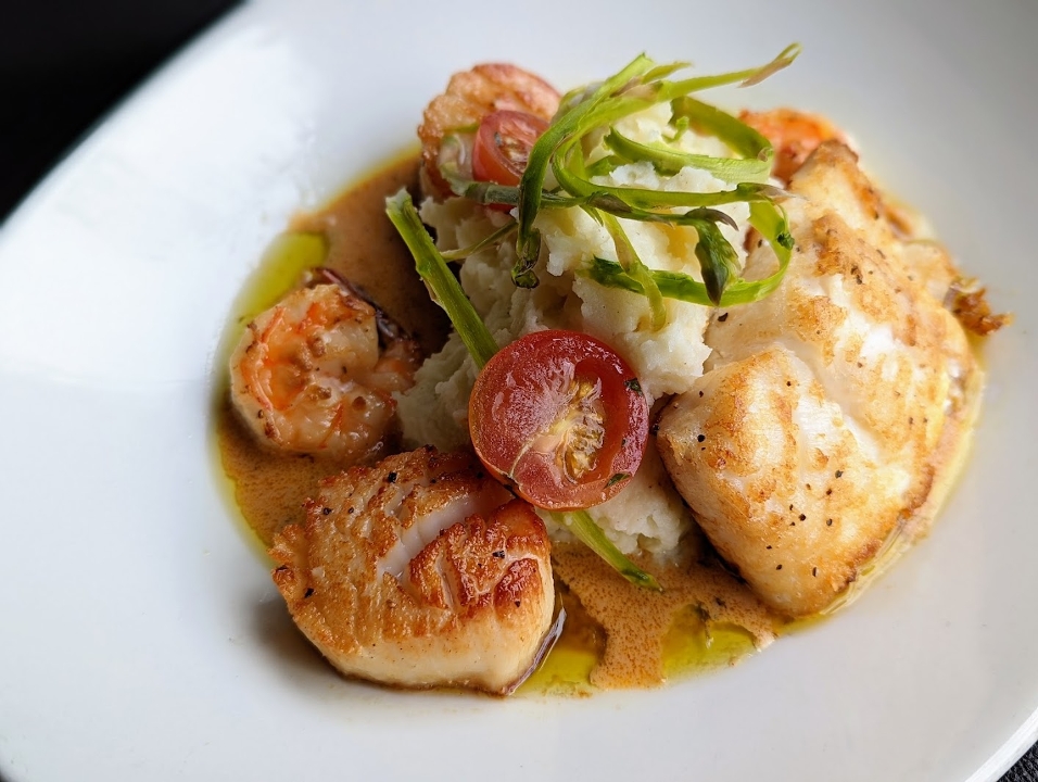Florida black grouper, jumbo sea scallops and shrimp, Champagne lobster sauce, potato puree, and shaved asparagus salad