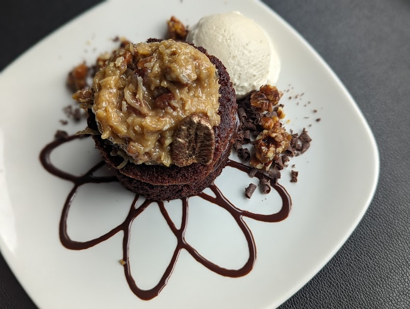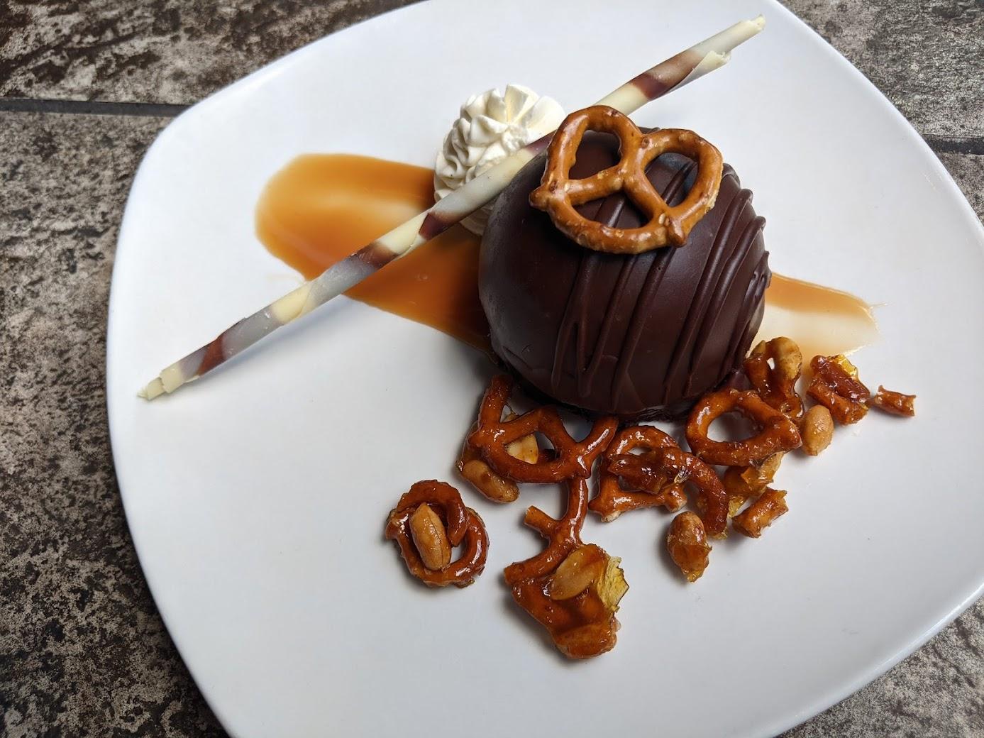 chocolate brownie, peanut butter mousse, caramel filling, dark chocolate glaze, peanut pretzel crunch, caramel sauce, chocolate cigarette, whipped cream