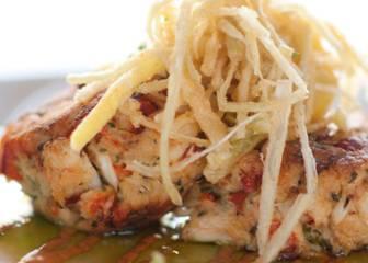 two crab and lobster cakes, served over roasted red pepper coulis and basil oil, topped with leeks and a lemon wrap